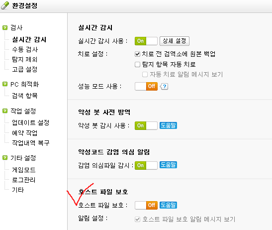 1. 알약 > 환경설정 > 호스트 파일 보호 Off