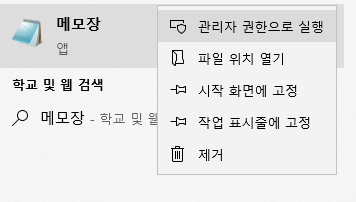 3. 메모장 관리자 권한으로 실행 > 호스트 파일 열기 > 수정 후 저장