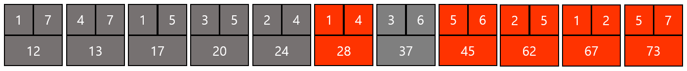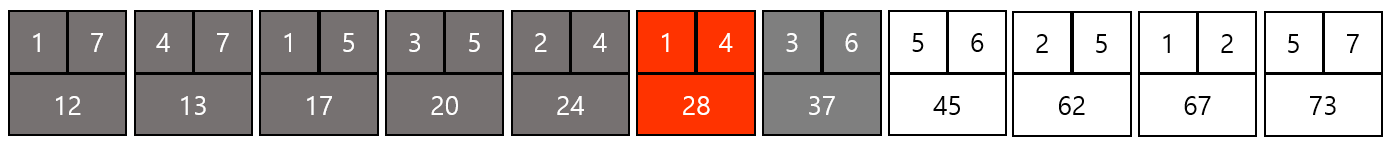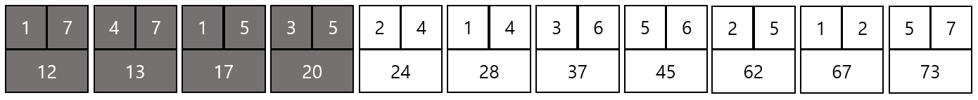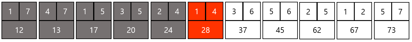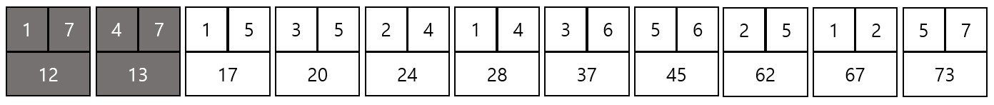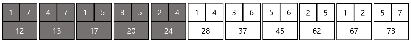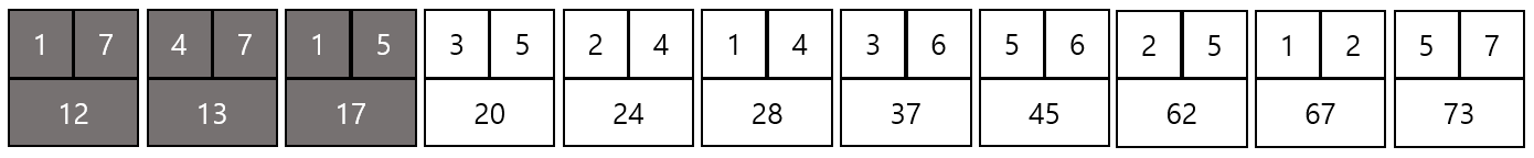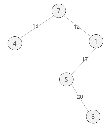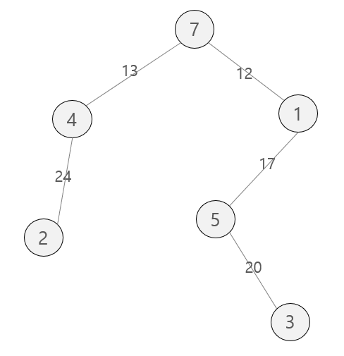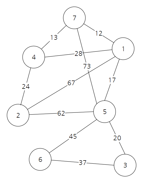 결과적으로 위와 같은 그래프가 만들어지고 총 비용은 12 + 13 + 17 + 20 + 24 + 37 = 123이 된다.