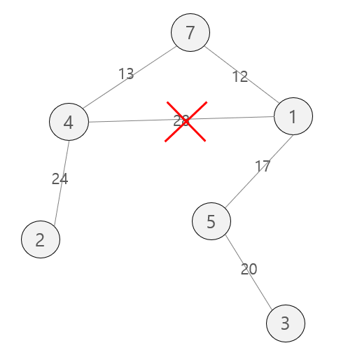 이미 정점 1과 4가 부모 노드 1로 연결이 되어있기 때문에 스킵(사이클 형성X)